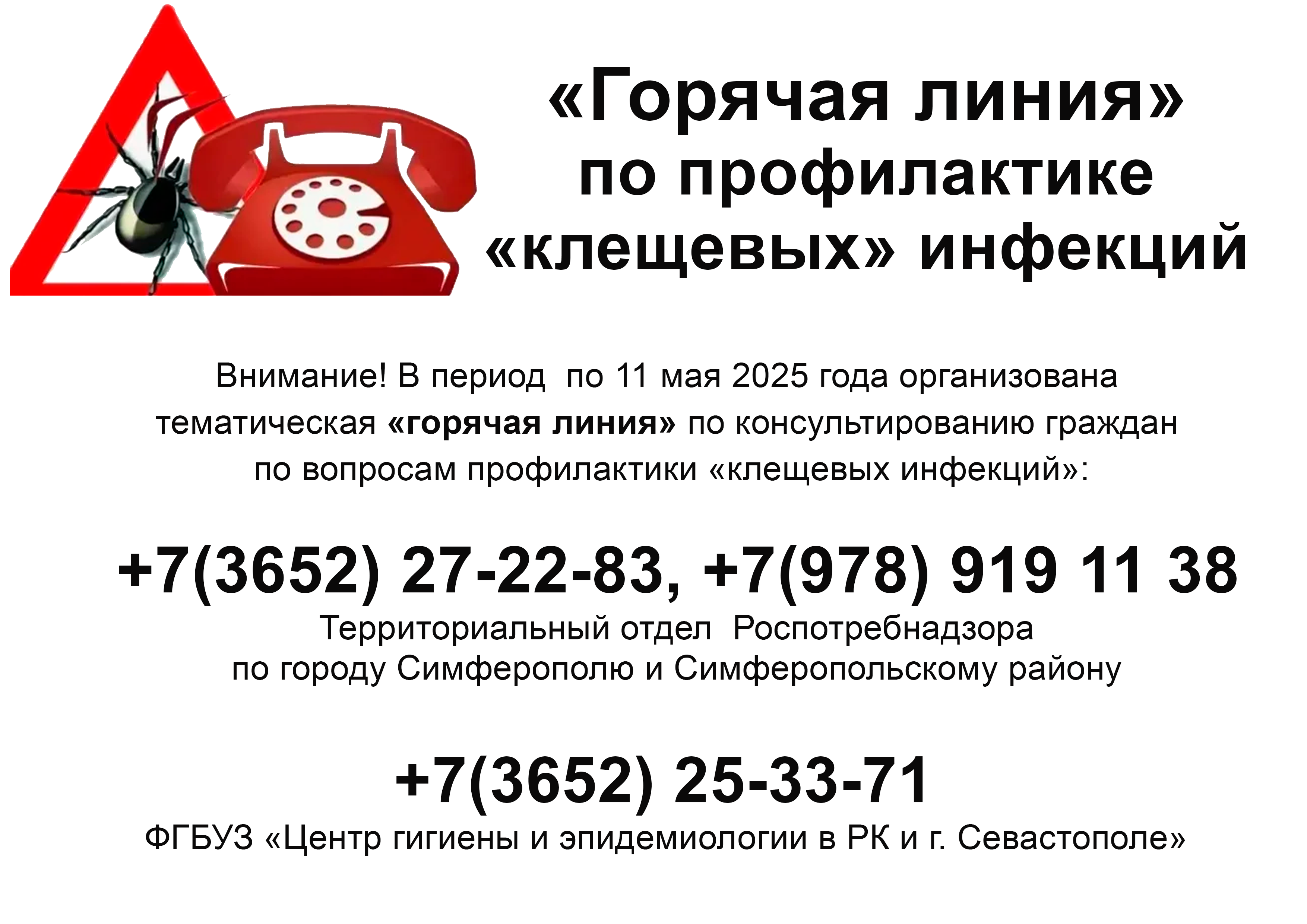 - Горячая линия по вопросам профилактики клещевого энцефалита и других инфекций, передающихся клещами с 28 апреля по 11 мая